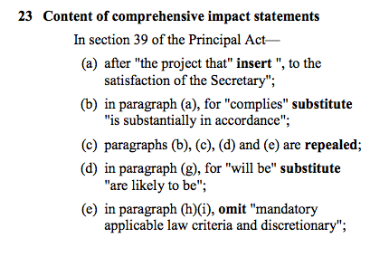 The changes, opposed by the Labor opposition and the Greens, mean the statement no longer needs an assessment of the impacts of the project, nor the methods considered to “avoid, minimise, or manage” the impacts.