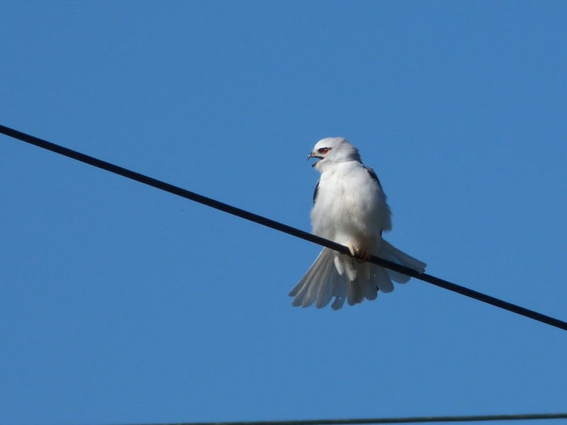 Ahead three Ravens engage in a family conference on the track and noisily fly up to perch on the electricity pylon where in August we saw a juvenile Black Shouldered Kite.