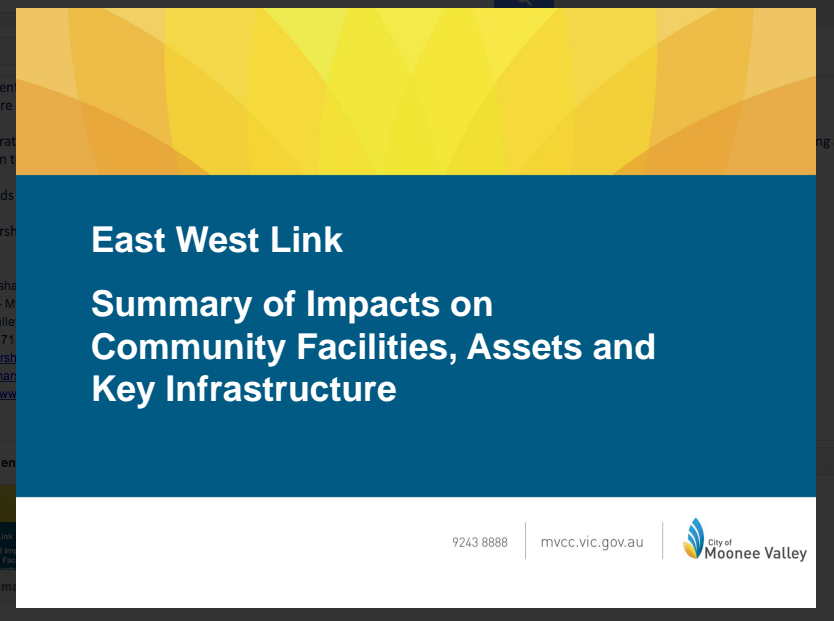 Other sites or infrastructure in the City of Moonee Valley that Council considers will be impacted by the proposed East West Link include: